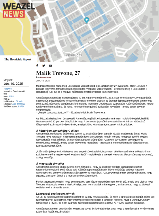 Carlito Létrehozva: Szeptember 10, 2024 Megosztás Létrehozva: Szeptember 10, 2024 (szerkesztve) Az Eastside Bounty Hunter Bloods (Hunnas) túlnyomórészt afro-amerikaiakból áll. Los Santos délkeleti részén fellelhetőek a Davisi Nickerson Gardens állami lakás projektekben. A Bounty Hunters megalakulása előtt ezen a területen a fő csoportot a Rhea Boyce (Ray) által vezetett Green Jackets néven ismerték, amely valójában kiterjedt a projektekre, ahol Al Pygmy volt a Green Jackets egyik vezetője. Gary Barker és Bobby Jack nevéhez köthető a banda eredeti megalakulása, ami a 112th utcában alakult ezért is hívják original blocknak az ott tevékenykedő settet. Az alapkoncepció az volt, hogy megvédik egymást és kisegítik a családokat a pénzügyi nehézségekből, de mivel akkoriban a fekete közösség elnyomásban szenvedett, ezért elengedhetetlen volt, hogy illegális úton szerezzék meg az ehhez szükséges pénzt. Hasonlókép mint a többi blood banda elődje crip bandák elnyomásában szenvedett, ekkor zárkóztak fel a crip elleni demonstrációnak és vették fel a közös struktúrát. Ismertek a Grape Street Rancho Crip ellen évtizedekig tartó konfliktusukról, amely már nem torkol oly nagy vérengzésbe mint a 80-as 90-es években. 1992 óta fegyverszünet van köztük és a többi Ranchoi banda között. Bár a fegyverszünet már egy ideje érvényben van, de időnként vannak problémák a jelenben is. A bandához köthető főbb események közé tartozik az az incidens, amikor egy tag rálőtt két forgalmi dugóban álló LSPD járőrre, akik bele is haltak a sérüléseikbe. Ők voltak a rendőrség történetében az első szolgálatban elhunyt tisztek, ezért ez nagy figyelmet fordított a Bounty Hunter Blood tagokra. Több razziát is tartottak a területen, a 2000-es évek elejére összesen harminc bandatagot csuktak le illegális szerek, vagy fegyverek birtoklása miatt. Másik nagyobb esemény, ami miatt a figyelem középpontjába kerültek, az volt, amikor egy Grape Street Crip tag rálőtt egy iskolabuszra, azzal a reménnyel, hogy egy Bounty Hunter tagot öl meg, de helyette egy ártatlan tizenhét éves lányt talált el. A kétezres évek után az apartmankomplexumban élő több ezer fiatal különböző csoportokra, klikkekre osztódott, amik együttesen a Bounty Hunter Bloods neve alá tartoznak, de a szokásokat nem olyan módon követik, mint az eredeti bandában lévők. A mostanáig nyilvántartott és frissen alakult klikkek közé sorolható például a Lot Boys, Block Boys, Bell Haven, Ace Line, Deuce Line(original block), Tray Line, Four Line és Five Line. A Bounty Hunter Blood aktívnak tekinthető még rappereit illetően is, egészen a 90-es évek elejétől a jelen korig sorolhatóak ide híresebb rapperek, akik zenéjükben is reprezentálták a bandát és kultúrájukat. Még Michael (Harry-O )Harris is a környékről származik, aki kötődött ehhez a környékhez, és 1987-ben elkészítette a „Checkmates” című darabot, amelyben Denzel Washington volt a főszereplő. Death Row lemezek megalakítása mögött álló pénzügyi izomnak tartották, amíg börtönben volt. Harrist 1987-ben elítélték emberrablásért és gyilkossági kísérletért, és 28 évre ítélték egy San Andreas állam börtönében. Közösen támogatták az O.F.T.B-t(Operation From The Bottom), amelynek együttese a Bounty Hunter Bloods tagjai voltak. Az 1971-es California krakkot követően a burgundy spanyol náthaként kezdte fertőzni a világot és ezt természetesen a dolgok szívében és sűrűjében álló Money-Town, Los Santos sem kerülhette ki. Bloods néven fut a bandák azon laza szövetsége, melynek gyökerei Davis városában keresendők, Los Santos megye egyik árnyékosabb körzetében. Az akkori törvényhozó Crips már '71 végére stabil alapokkal rendelkezett Los Santos megtört, gang-ek szennyezte utcáin, generációkra megvetve a lábát. Szintén ebben az évben lépett laza szövetségre az Avalon Garden Crips és az Inglewood Crips más, kisebb-nagyobb Crips branch-el és ezen struktúra indított útjára egy viszonylag nagyobb vadászidényt, melyben több ártatlan, gang életből teljesen kimaradó civil is áldozatul esett a helyenként teljesen értelmetlen erőszaknak. A Crips pestis módjára terjedt, betörve a semleges, független (Non-Crips) bandák területeire, melyek struktúra és szövetségek hiányában védtelenek voltak. Ilyen frakció volt például az 1969-es alapítású Brims, melynek Los Santos nyugati oldalán tették le az alapköveit. 1971-re sikerült kinőnie magát L.S. egyik legerősebb független csoportjává. A Crips pont a függetlenségük miatt támadta ezeket a street gang-eket, mivel backup hiányában jelentős erőkülönbség mutatkozott minden esetben a Crips javára, ami így könnyen ejtett prédát. Ebben az időben a Piru Street Boys egy meghatározó névnek számított Davis berkein belül és 1972-re megváltotta tagságát a Crips növekvő légiójába. Kevesek által ismert tény, hogy tagsága alatt a gang a Piru Street Crips neve alatt csordogált és Crip bangerhez méltóan a bal oldalon flagelt. 1972 nyarán azonban a Piru Street Crips konfliktusba keveredett a többi Crip gang-el, kirobbantva egy történelmet átíró, vérest bandaháborút. A viszály egy Crip-ek által elkövetett, Sunset Boulevard-on történt gyilkosságra épült. Március 21-én, miután a Vinewood Palladium-ban lement egy koncert, körülbelül 20, több set-ből származó crippin rátámadt több ártatlan fiatalra, megfosztva őket a pénztárcájuktól, illetve drágább ruhadarabjaiktól. Robert Ballou Jr. a helyszínen belehalt a sérüléseibe, miután az ellenállását túlzott mértékű erőszakkal büntették. Robert nem volt tagja semmilyen bandának sem és a "hoodlum" életformától is messze állt, így neutrális személynek volt tekin